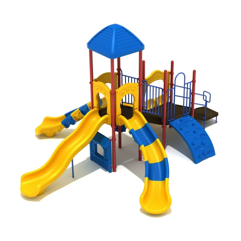 The Clash of the Tridents Playground is a kingdom of its own that mimics the shape of Poseidon’s weapon. A wide range of children can easily play on this structure, from toddlers to preteens. The Left Turn, Wave and Right Turn Slide make up the fork, while providing a variety of fun slides that children can glide down. In addition to the three slides, there is the Double Slide that is twice as fun as children can slide down with a friend. For access to the slides kids can climb up to them using the Sea Creature Climber. This structure is also ADA accessible as its bottom panels and activities provide access to those who may not be able to climb the structure. These panels include the Bench Panel, Bongos, Store Panel and Ship’s Wheel. This structure comes Quick Ship in Primary and Neutral colors, but you can choose to custom color it. Custom colors are available and typically take around 10-14 weeks to ship.