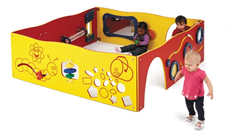 The Four Panel Learn-A-Lot is a great learning tool for kids ages 6 months to 2 years. The perfect piece for daycare centers, children can use this multisensory tool to improve their motor skills while having fun. The Playful Color Scheme is pictured with predominately reds and yellows, there are also green and blue accents which can help teach about colors. A natural color scheme is available with mainly greens and tans. Shapes and mechanisms offer excellent learning tools for the young ones. The Four Panel Learn-A-Lot can be arranged in a square or zig-zag pattern to fit just about any space.