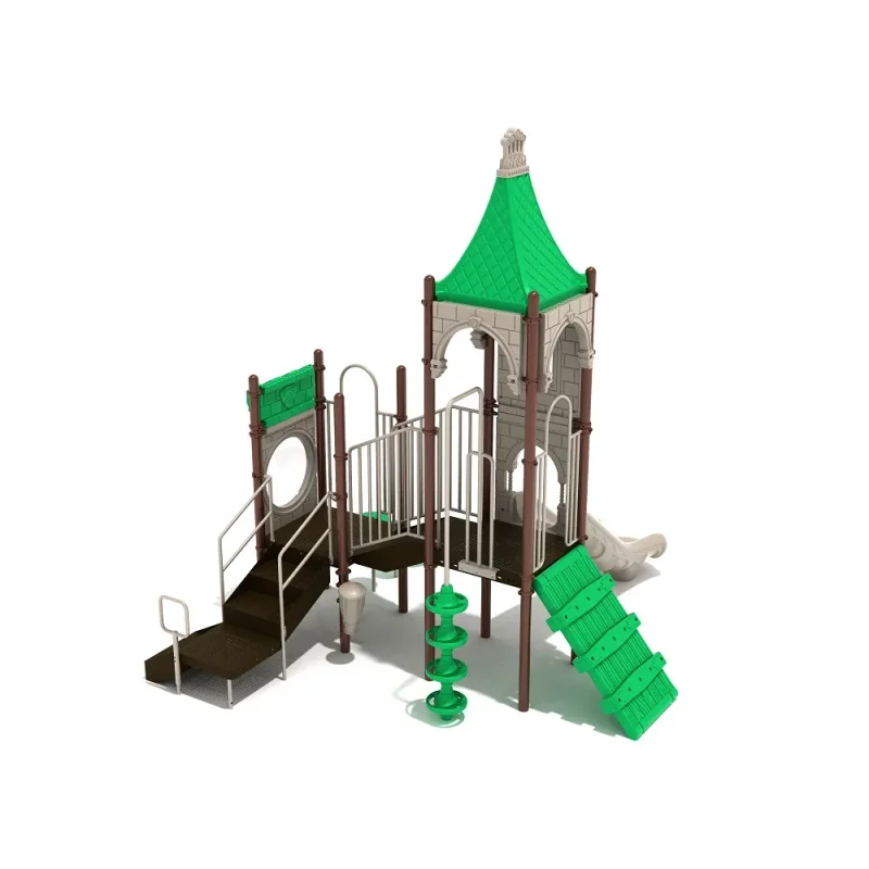 Daring playground-goers are invited into Gryphon’s Growl, one of the newest additions to PlaygroundEquipment.com’s Castle Series. There are so many different interactive features, children will surely be able to play for hours and hours on end. This structure is multi-leveled, allowing for diversity of components and activities for kids to participate in. On the ground level, there is a drum attachment, which will allow for kids to express their blossoming musical and rhythmic abilities. There are also several different ways to climb up this structure, including a draw bridge climber, a pod climber, a set of stairs, and three pebble climbers.Once the kids have reached the very top platform of the play structure, they are able to fly down the amazing straight slide back to the bottom of the structure. This castle-themed structure is sure to encourage imaginative play for each and every kid that interacts with it. Gryphon’s Growl is perfect for any brave and adventurous playground-goer.