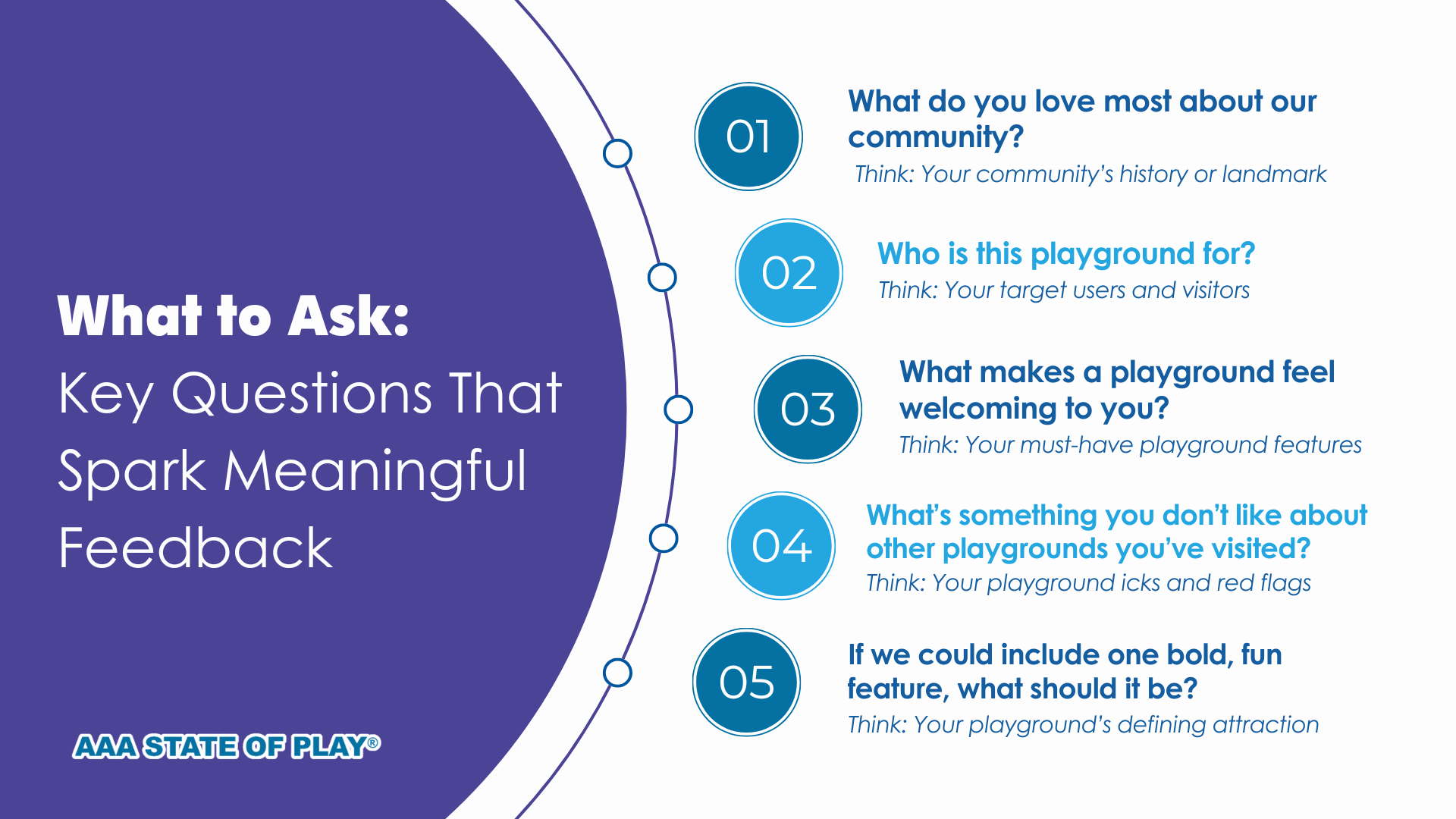 If you simply ask, “What kind of playground do you want?” expect a lot of “swings and slides” and other generic answers. While these are acceptable answers, they would barely scratch the surface. Instead, try questions that get people thinking beyond the obvious: