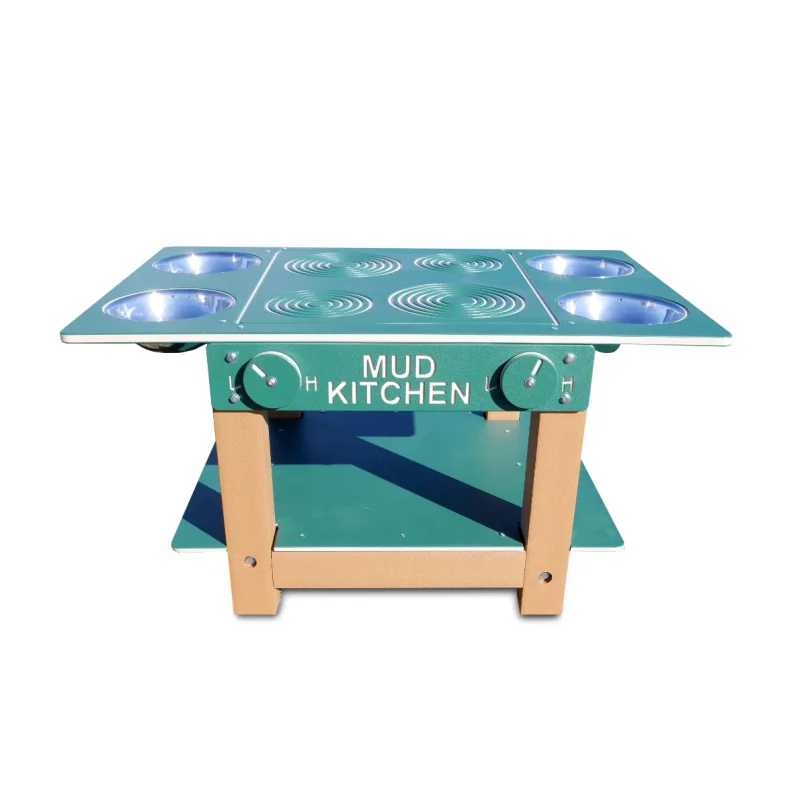 Mudpies have never been so sophisticated with the Island Mud Kitchen. Emblazoned with signage and rendered in hunter green plastic, the Mud Kitchen features four removable steel bowls, perfect for budding mud chefs whipping up their latest concoctions. A shelf underneath the stove space provides ample room for kids to store supplies like cookie cutters, dishes, decorative rocks, candles, pebbles, sticks, flowers, and other pie-making accessories and nature finds. A truly unique and adorable playtime model, the Island Mud Kitchen accommodates at least four children at a time and provides a creative outlet for kids seeking to explore their environment using the materials around them. Four pretend burners add charm and interest and provide an assembly area for your little mud bakers! Accessible to children of all ages and ability levels, the Island Mud Kitchen is an inclusive and engaging toy that will hold up to many years of imaginative fun!