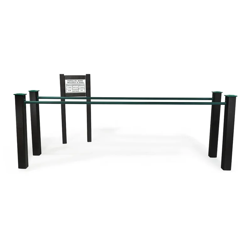 Play Mart’s Recycled Plastic Fitness Parallel Bars with Exercise Panel provides a time-proven exercise that would make an excellent addition to your site’s fitness trail, park space, or schoolyard. The robust stainless steel rails help users strengthen their arms and central torso as they attempt to elevate their bodies up and over the bars in order to shuffle along using only their upper musculature. And this unit will also work as a great introduction for curious users looking to explore entry-level gymnastics. Significant portions of this product use Play Mart’s proprietary Recycled Structural Plastic (RSP), which has zero of the issues of traditional wooden fitness equipment. Painting upkeep is reduced for RSP and the material will not produce bothersome splinters. The material is also graffiti resistant and will not rot as natural wood tends to do. The Recycled Plastic Fitness Parallel Bars with Exercise Panel come with an HDPE sign that suggests both entry-level and advanced leve...