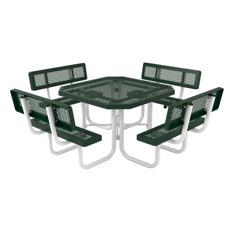 If your outdoor eating or sitting areas tend to invite others to kick back and stay awhile, all of your guests will love the comfort of the Regal with Back Octagon Portable Table by Webcoat. This octagon shaped table features four attached seats with separately attached backs to create a comfortable seating arrangement. The seats and table are made from expanded 3/4-inch #9 expanded metal to provide some of the highest levels of durability you can find in outdoor picnic tables. The portable style allows you to move the table around at your whim so you do not have to be locked into a specific seating arrangement. Both the seats and tabletop are covered in a textured polyethylene coating to protect the metal and keep the table looking brand new. You can choose from various colors for the seats and tabletop depending on your preferences. You may also choose from a mix of powder-coated frame colors to complement the rest of the unit.
