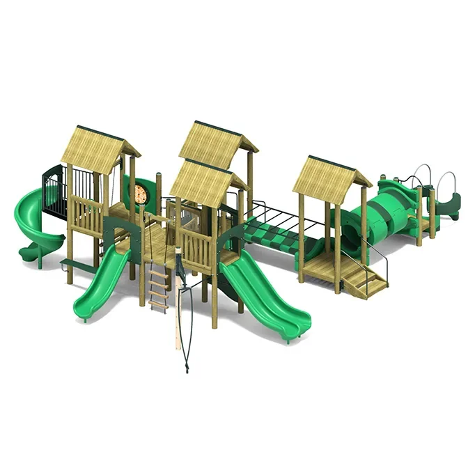 Discover a world of creative adventure into new realms with the Sherpa Playset! This activity-packed structure includes a host of seventeen fun accessories, including DuoChute and Single Chute Slides, a Curly Slide, a Tube Tunnel, Climbers, a collection of covered towers, and much more. The Sherpa playset is constructed using sturdy, weatherproof materials, and can accommodate up to sixty children at a time, making it perfect for schools, playgrounds, and daycare centers that cater to large numbers of kids. The Sherpa is constructed from a handsome wood frame, features recycled structural plastic elements, and boasts ADA accessible entryways so that explorers and leaders of all ability levels can participate! Its use zone measures 54'4" x 42'2.”