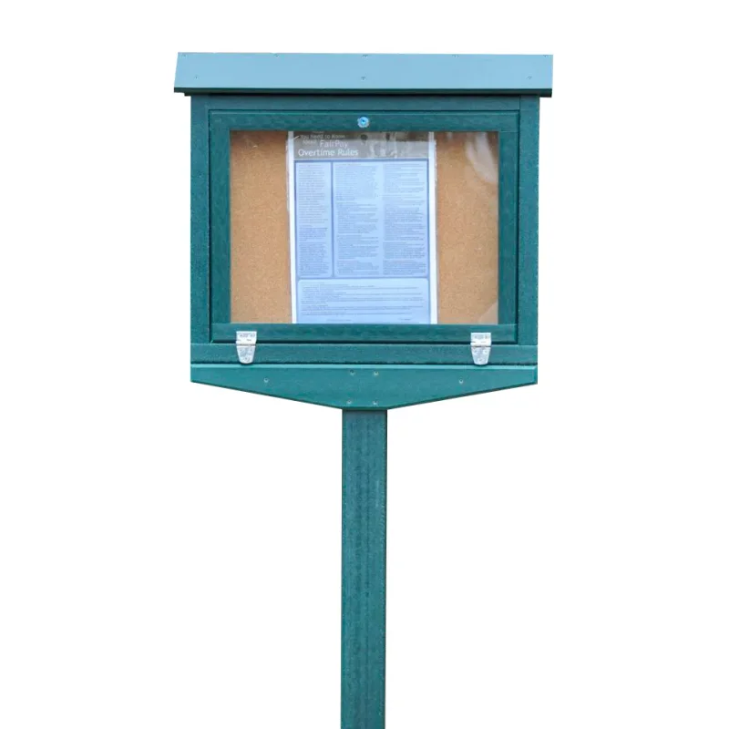 Use the durable and long lasting Small Hinged Message Center as a place to post your messages of importance that you wish to convey to park-goers. The message center has two hinges that attach to a shatter resistant door, making for easy placement and changing of messages. It also has a vandal resistant locking mechanism so you don’t have to worry about theft or unwarranted changes. It is made from industry leading eco-durable recycled plastic, has high quality cork, and comes with marine-grade stainless steel hardware. Since the recycled plastic is eco-durable is can withstand all the elements of nature, and it is also easy to wipe down. The Small Hinged Message Center is available in cedar or green. You can order it as one-sided with one post, or one-sided with no post. The post is 6-feet before install.