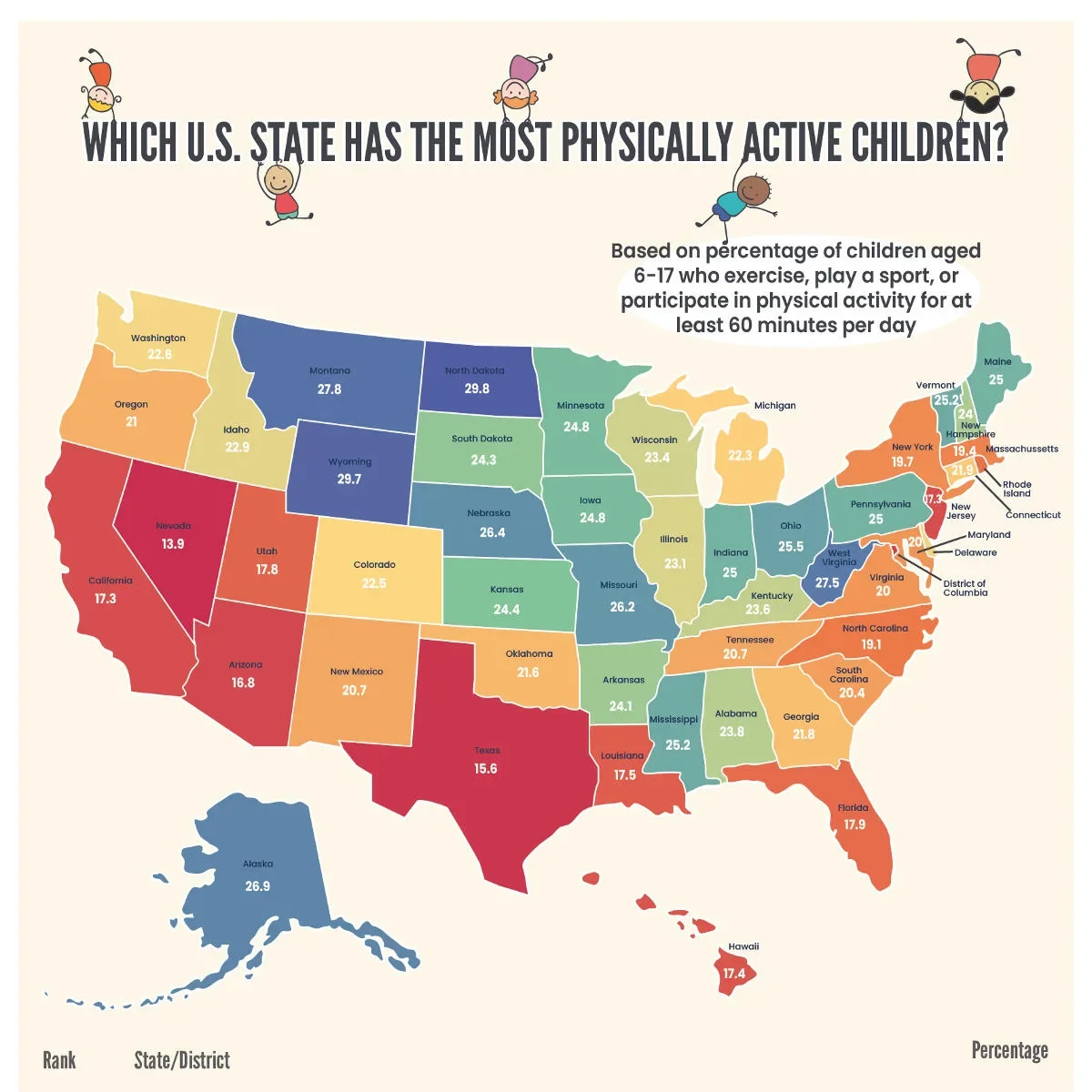 It is common knowledge that physical activity is important for the overall health and well-being of children. How much exercise do children need? The Centers for Disease Control and Prevention’s physical activity guidelines for children vary with age. Children ages 3 through 5 years should be active in various ways throughout the day – this can occur naturally through play, exploration, and just having fun. Children and adolescents ages 6 through 17 are recommended to engage in 60 minutes or more of moderate to vigorous physical exercise daily. This includes aerobic activity (anything that gets the heart beating faster like walking, running, and biking), muscle-strengthening (such as climbing, hiking, and push-ups), and bone-strengthening (high-impact activities like jumping and running). A rich variety of exercise nurtures every aspect of child development and create habits that lead to a healthy, happy adult life. So what are the most physically active U.S. states for children? The team at AAAStateofPlay explored child health data to find where children are the most and least physically active. Let’s jump in:
